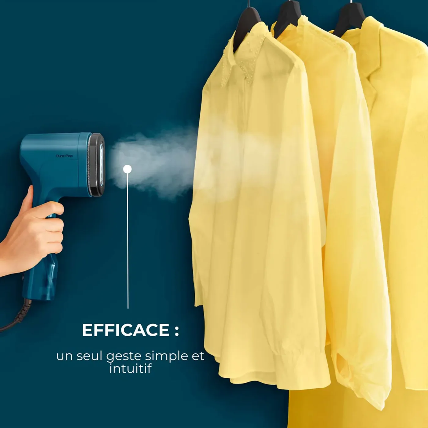 Pure Pop Garment Steamer, pad réversible, pochette de voyage / stockage.