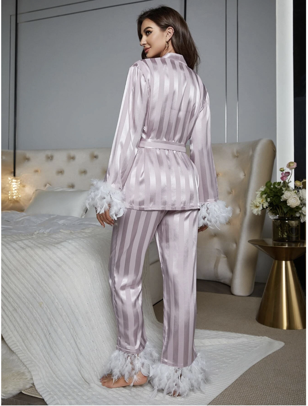 طقم بيجامة من الساتان المخطط بالجاكار