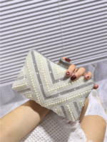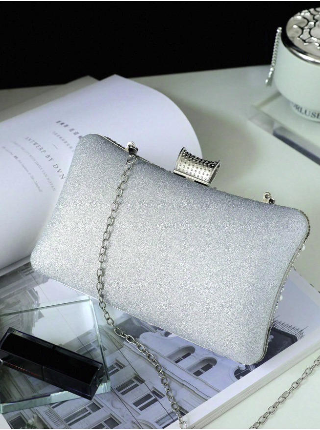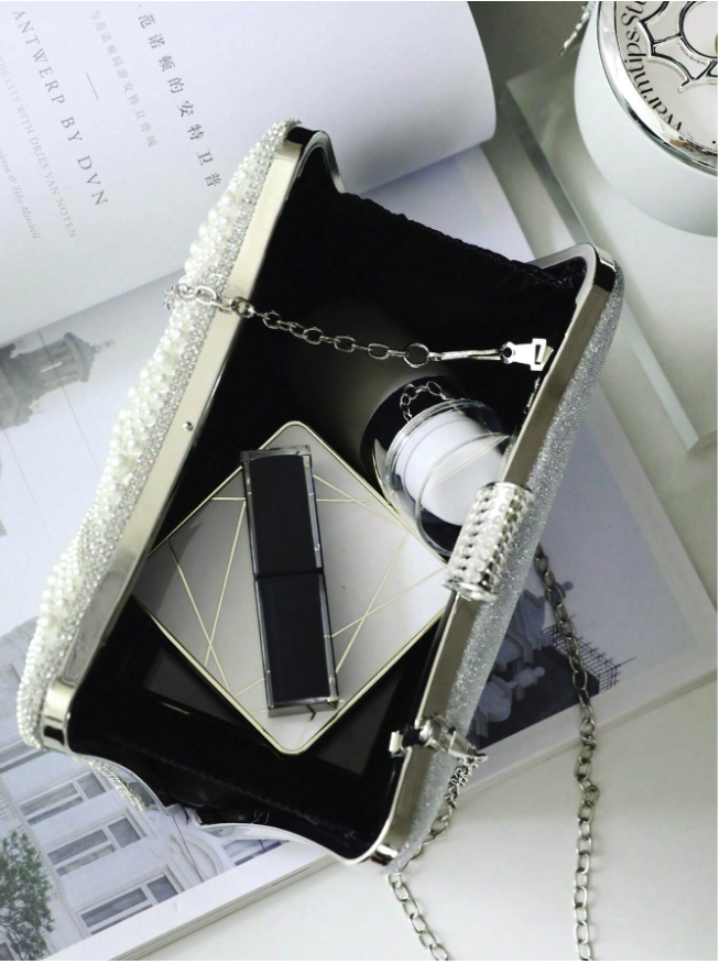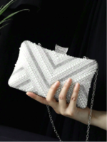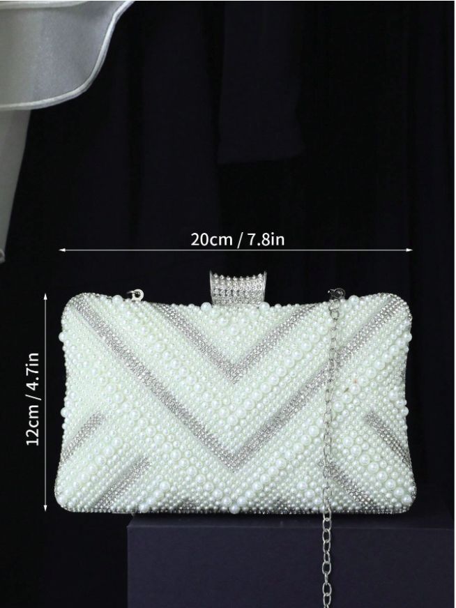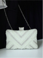 حقيبة سهرة أنيقة وعصرية من الفضة مرصعة باللؤلؤ الصناعي وأحجار الراين في صندوق، مناسبة لحفلات الزفاف،