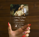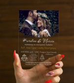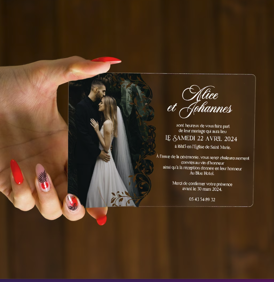 La belle acrylique satinée des invitations est phénoménale. La possibilité d’imprimer votre photo directement sur leur surface fera que les invités s’en souviendront longtemps.